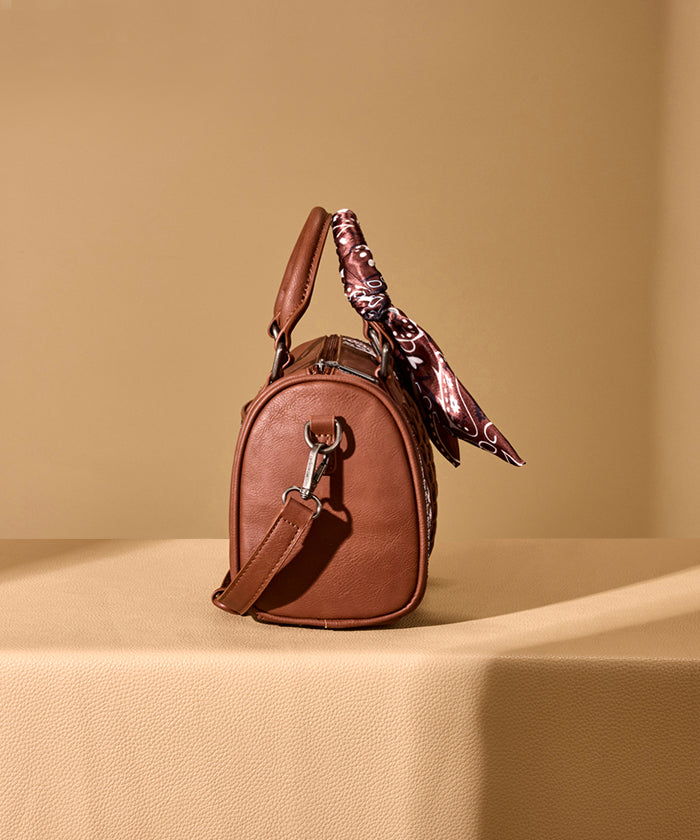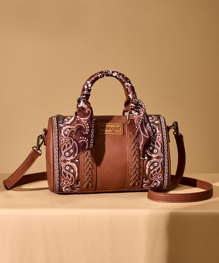 Ideal for carrying essentials, this Wrangler bag with a detachable and adjustable shoulder strap allows for versatile carry options. The rounded top and structured body offer a timeless Boston bag shape, while the scarf-wrapped top handle adds a unique decorative touch.