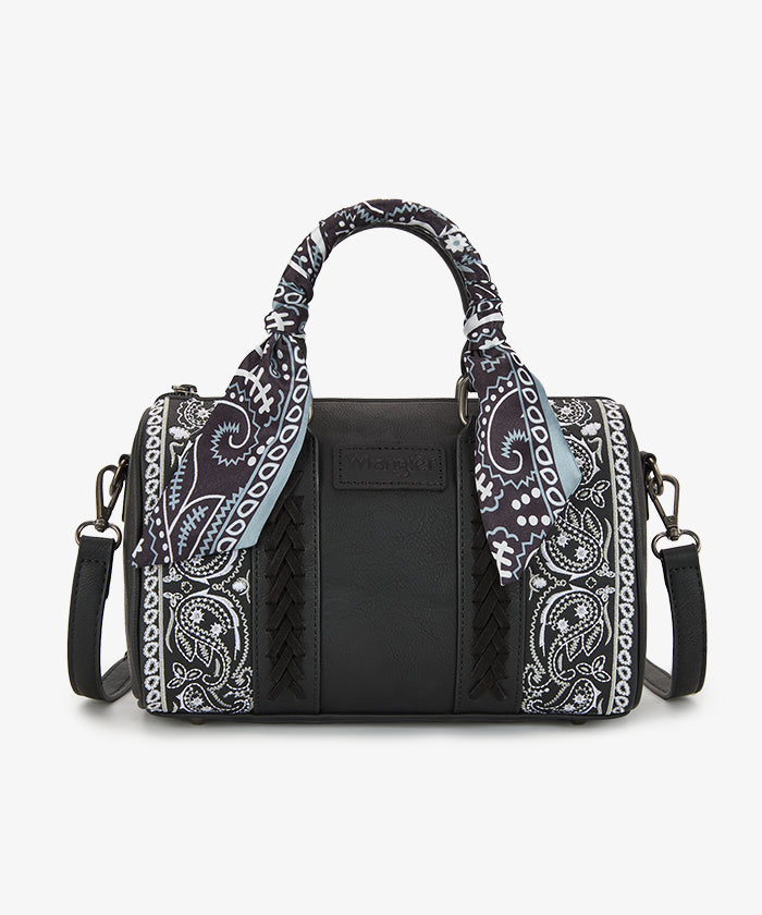Ideal for carrying essentials, this Wrangler bag with a detachable and adjustable shoulder strap allows for versatile carry options. The rounded top and structured body offer a timeless Boston bag shape, while the scarf-wrapped top handle adds a unique decorative touch.